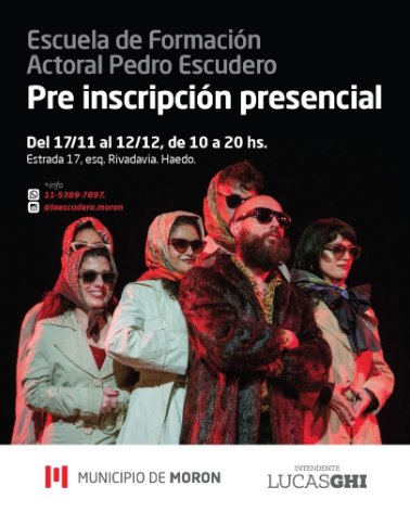 El Municipio de Morón informa que del 17 de noviembre al 12 de diciembre, de 10 a 20 hs, abrirá la preinscripción presencial para ingresar a la Escuela de Formación Actoral Pedro Escudero. Las y los interesados podrán acercarse al edificio ubicado en Estrada 17, esquina Rivadavia, Haedo. Para más información, pueden comunicarse al 11-5369-7097.